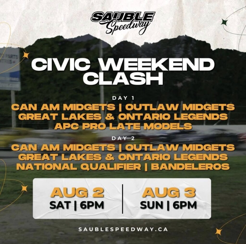 The Civic Weekend Clash has arrived! Come out to Sauble Speedway tonight for an exciting night of racing Saturday and Sunday evening. The Great Lakes Legends Series Powered by Freshstone Brands is racing in conjunction with the Ontario Legend Car Series for the next two days!!